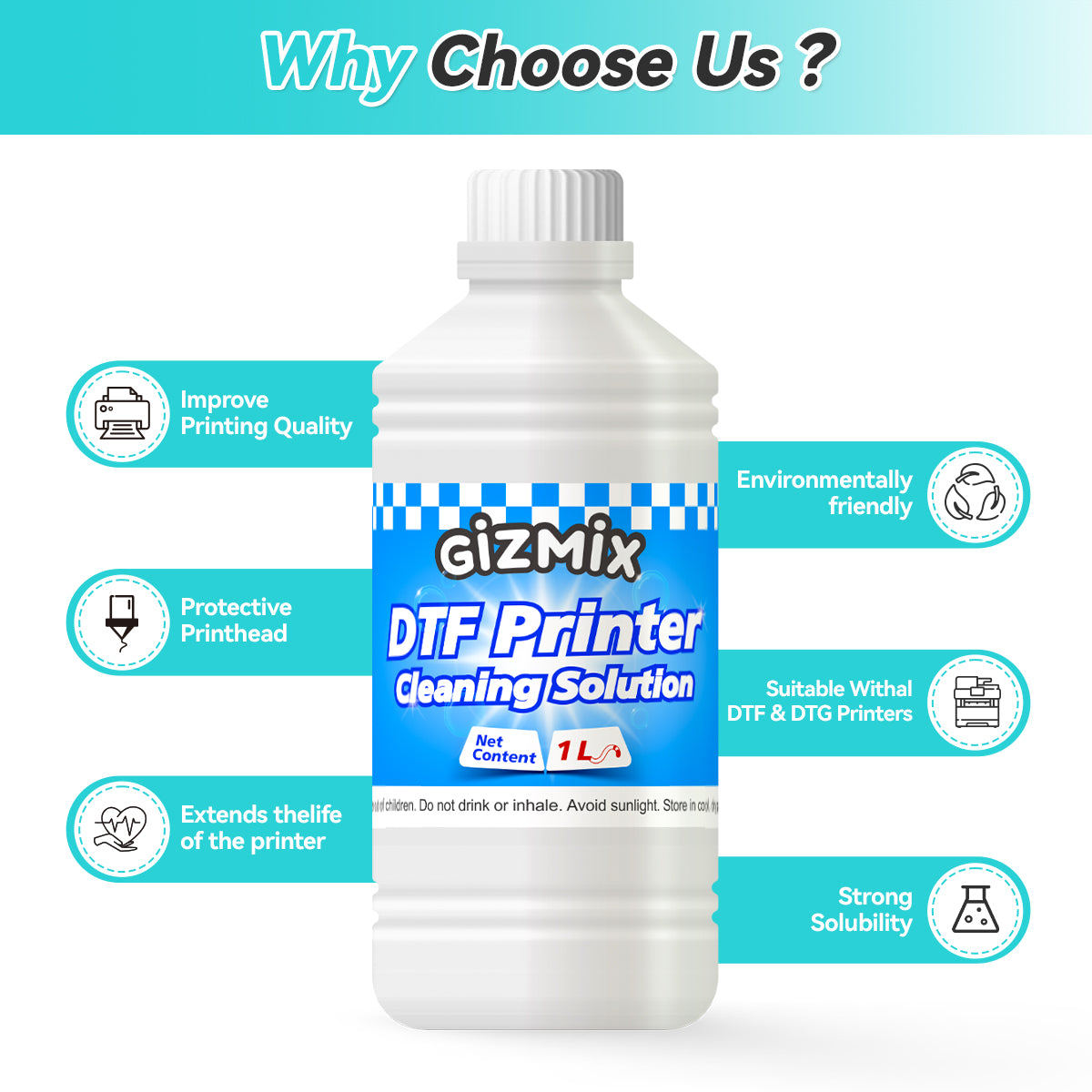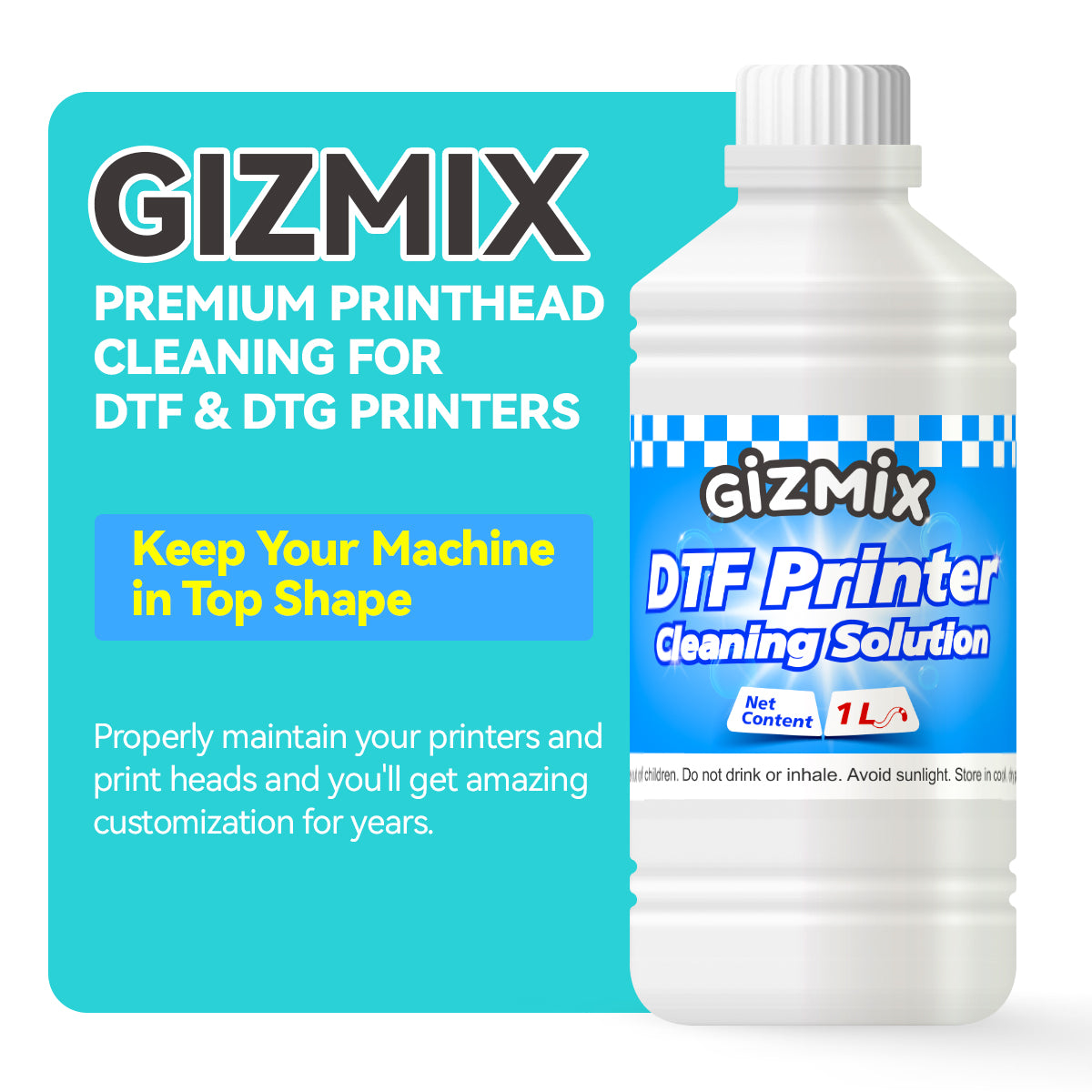 Experience smoother printing, brighter colors, and longer printhead life with GIZMIX DTF Printhead Cleaning Solution.