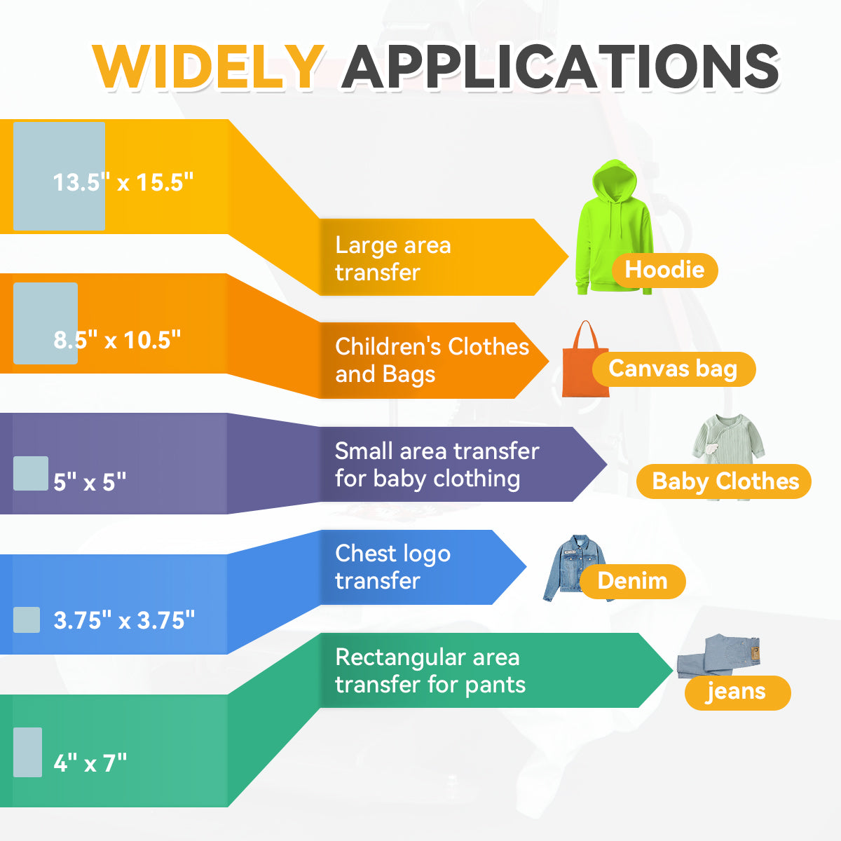 Includes a full range of pad sizes to support everything from chest logos to large back prints.