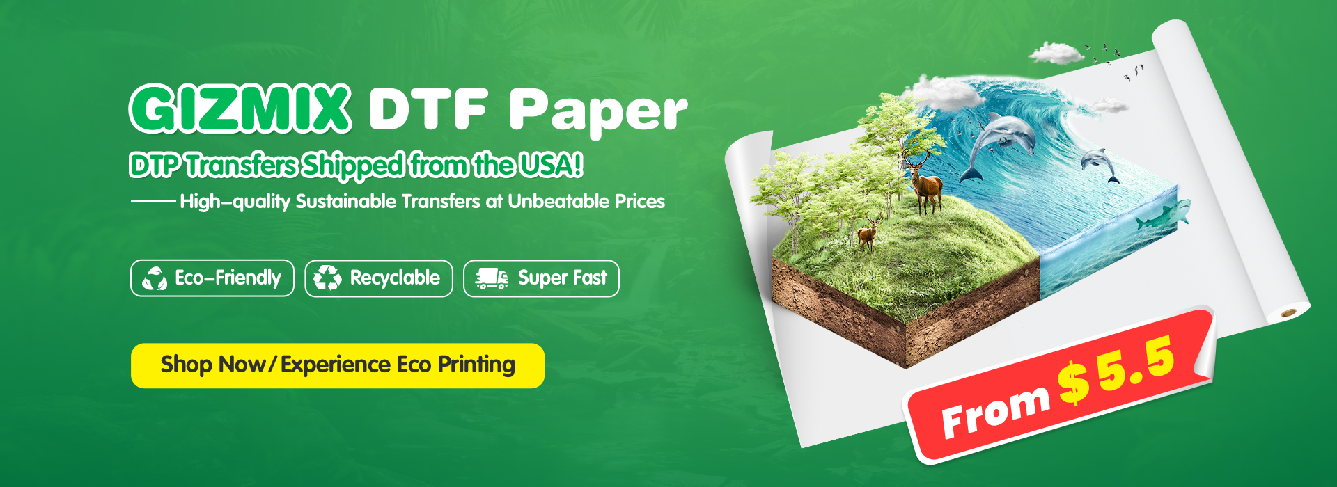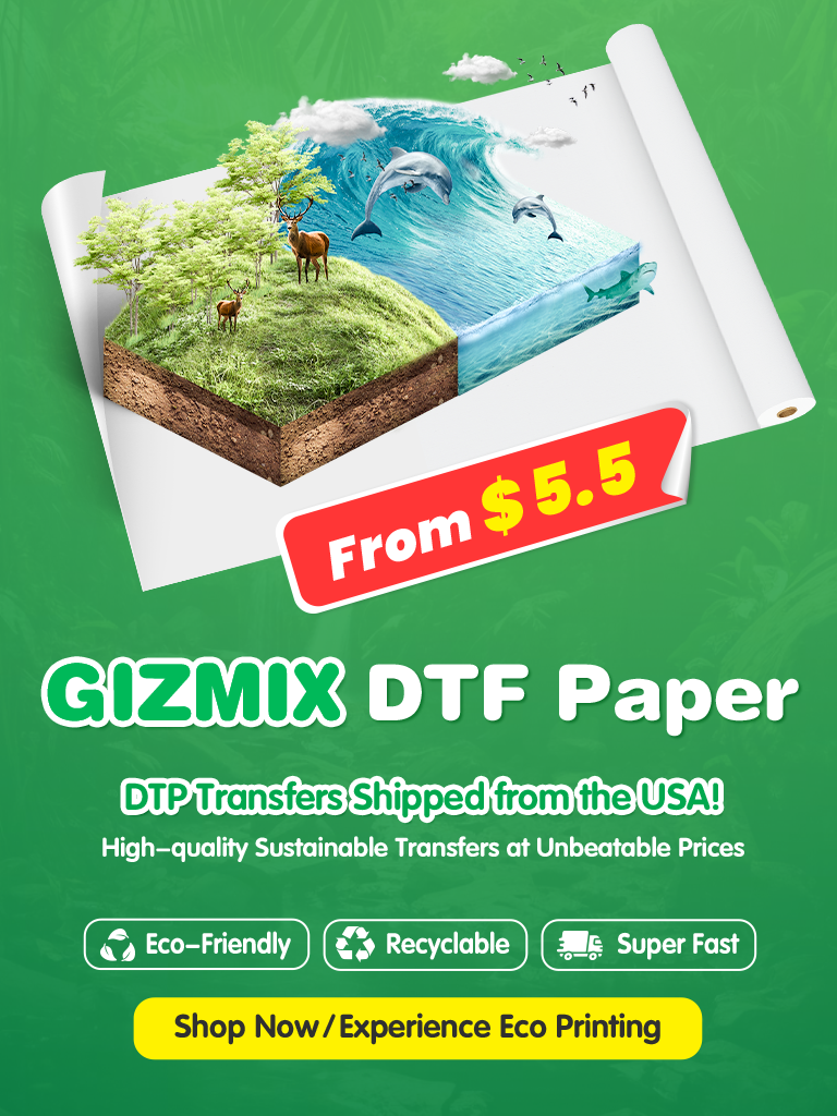 Proveedor:GIZMIXPapel de transferencia DTF ecológico GIZMIX: 100 % reciclable, impresión directa al papel, sin película plástica, colores vibrantes, fuerte adhesión, despegado en frío, tamaños A4/A3 para todas las impresoras DTF.