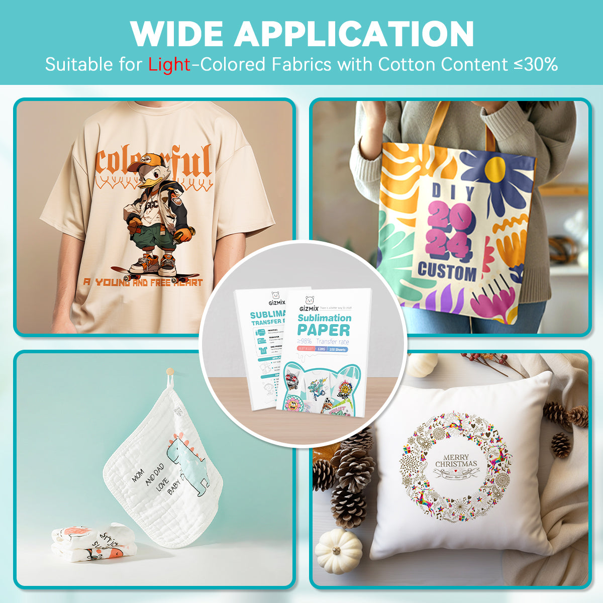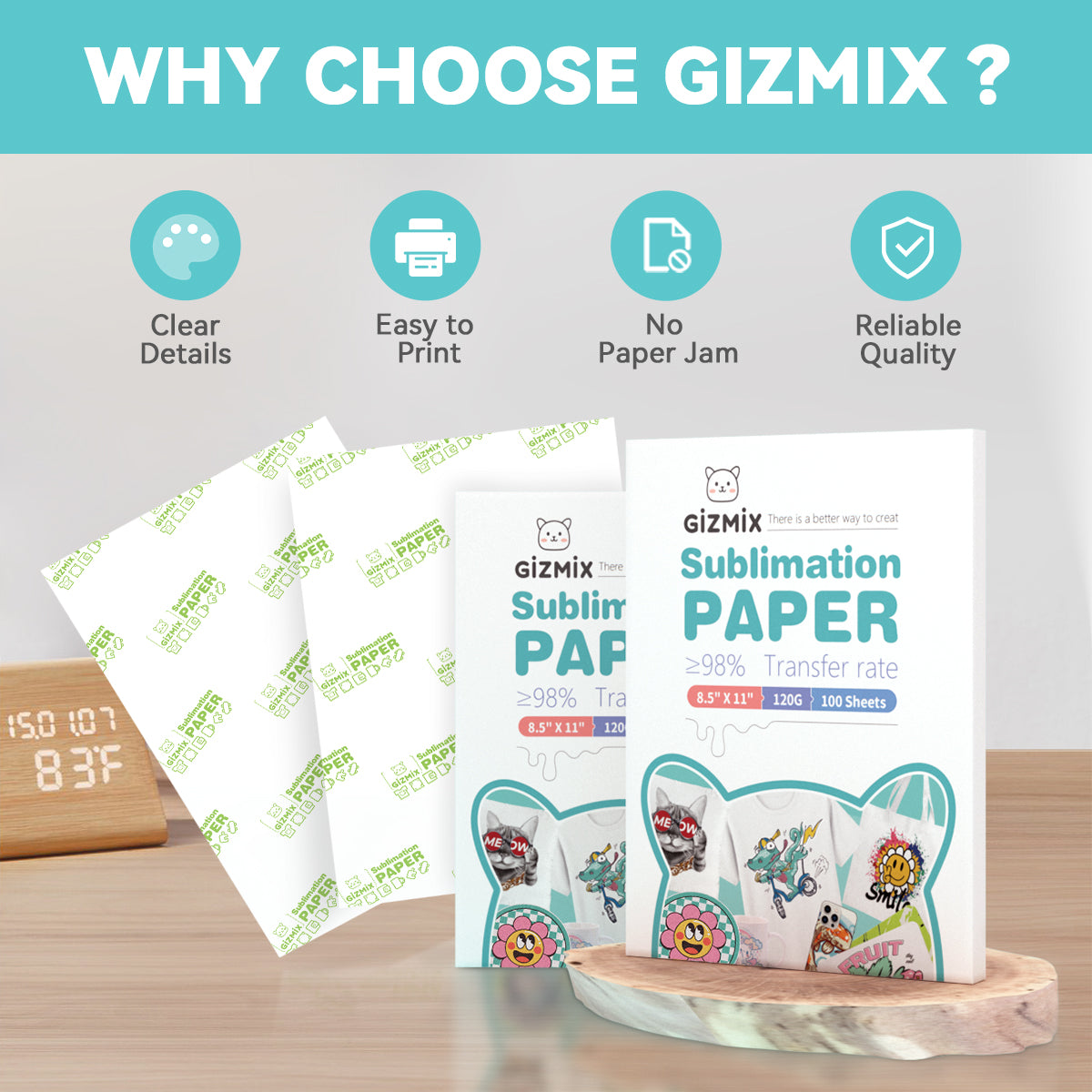 El papel de sublimación GIZMIX presenta una tasa de transferencia ultra alta ≥98% , rápida absorción de tinta y un rendimiento de impresión suave, perfecto para camisetas, tazas, vasos, regalos personalizados y más.