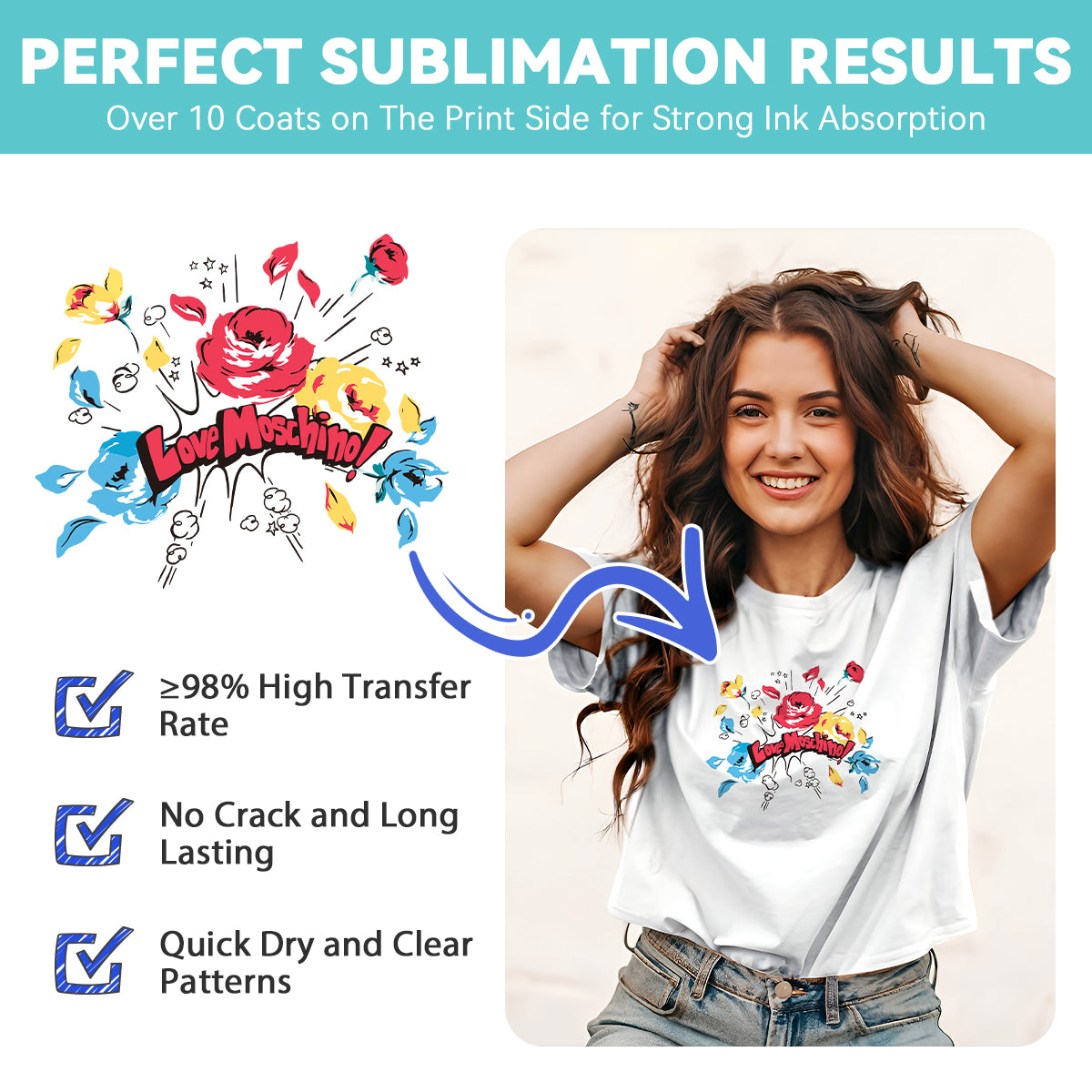 Sus diseños transferidos se mantienen vibrantes, duraderos y resistentes al lavado.