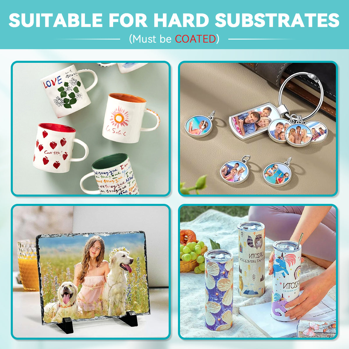 ✔ Sustratos duros recubiertos (deben estar recubiertos por sublimación)