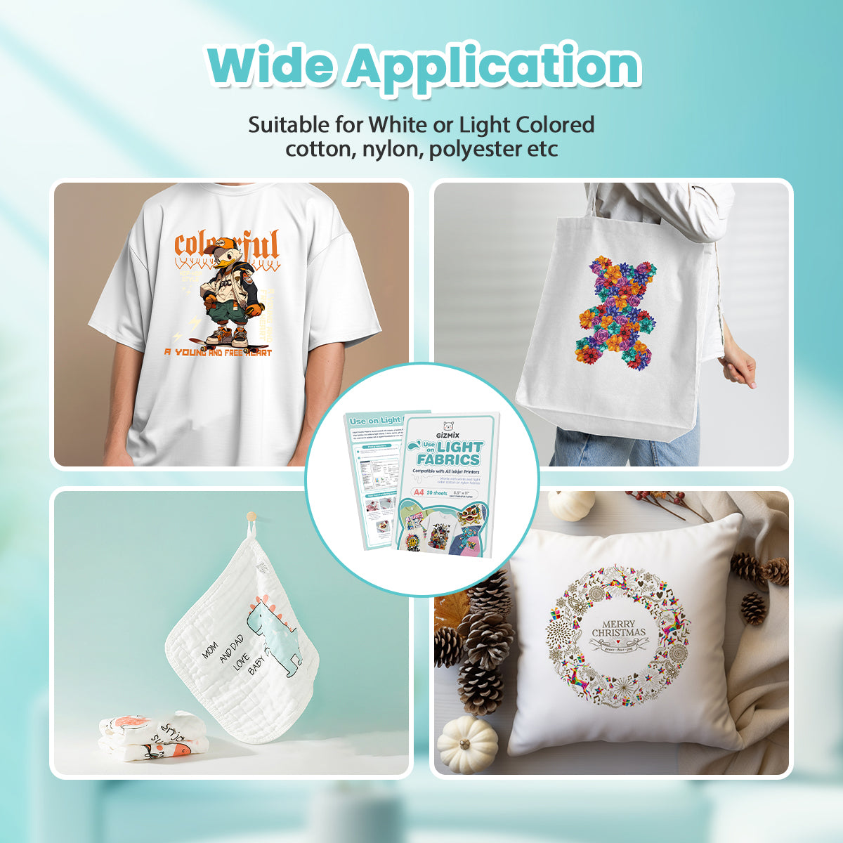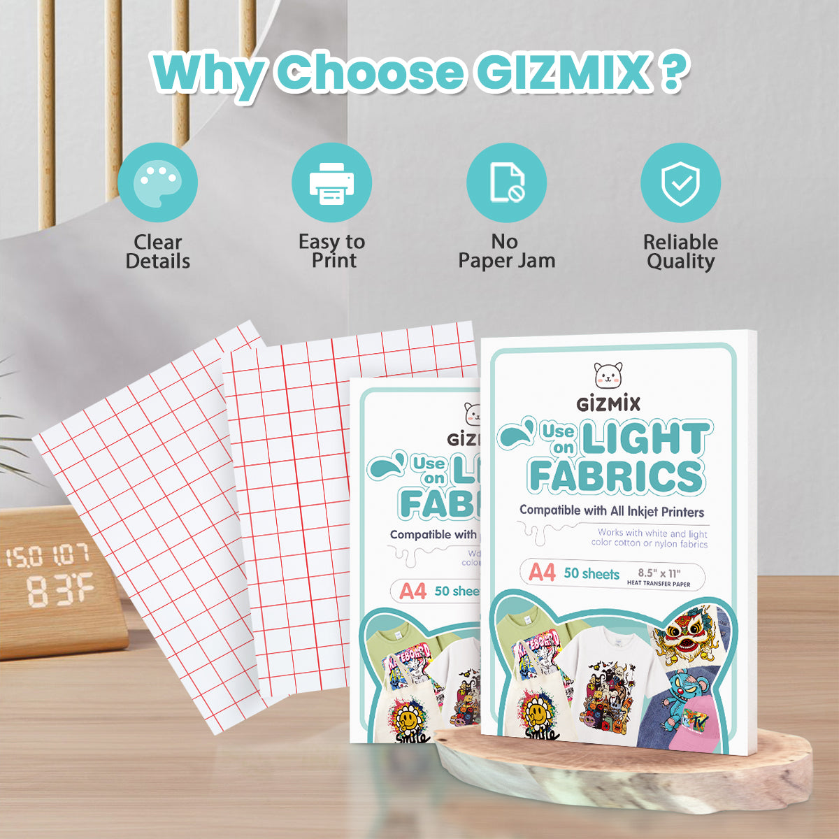 ¡Da vida a tu creatividad con el papel de transferencia térmica premium GIZMIX! Diseñado para telas blancas y de colores claros, este papel termoadhesivo para inyección de tinta ofrece colores vibrantes, detalles nítidos y resultados duraderos. Perfecto para aficionados a las manualidades, pequeñas empresas y cualquier persona que ame la ropa y los regalos personalizados.