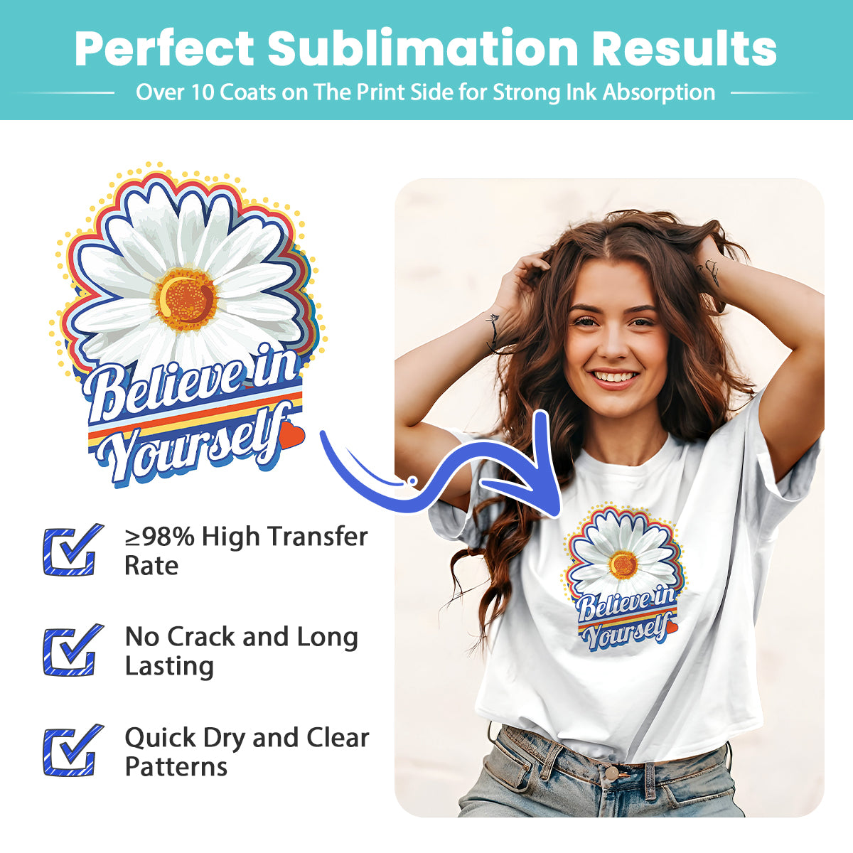 Nuestro recubrimiento mejorado garantiza una excelente absorción de la tinta, produciendo diseños brillantes y de alta definición que lucen exactamente como los imaginaste. Cada impresión luce limpia, nítida y profesional, ideal para fotos, ilustraciones, logotipos y diseños personalizados.