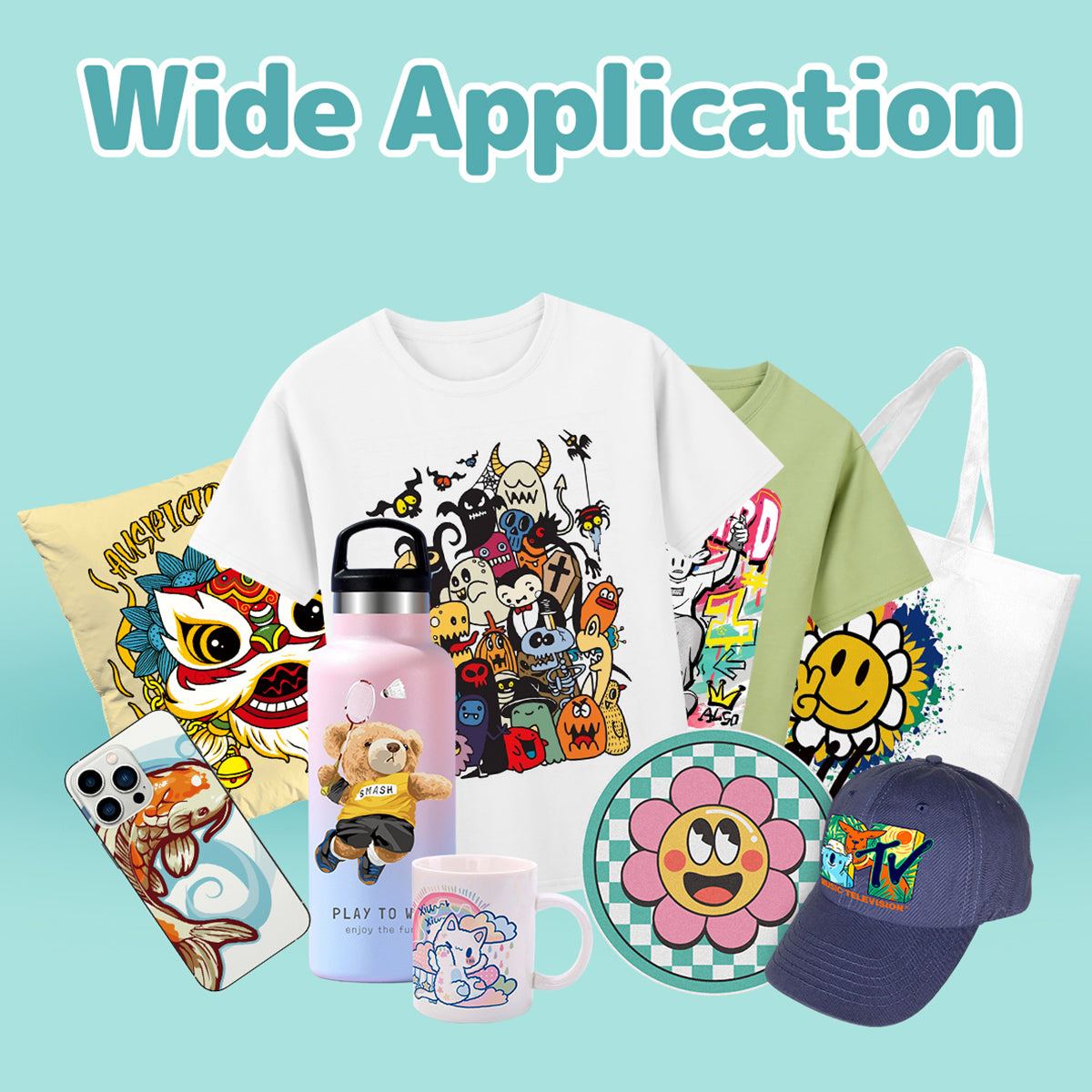 T-shirts, mugs, pillows, caps, tote bags, phone cases, coasters, metal plates, puzzles, polyester fabrics, heat-transfer blanks.